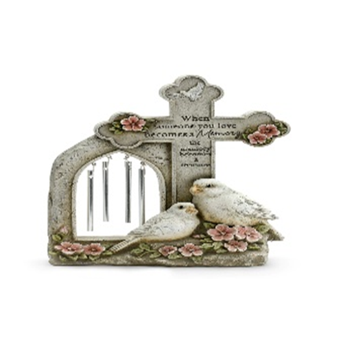 11 1/2"Resin and Metal Dove/Cross Windchime. 11.5" H. When Someone you Love Becoes a Memory the Memory becomes a Treasure.
