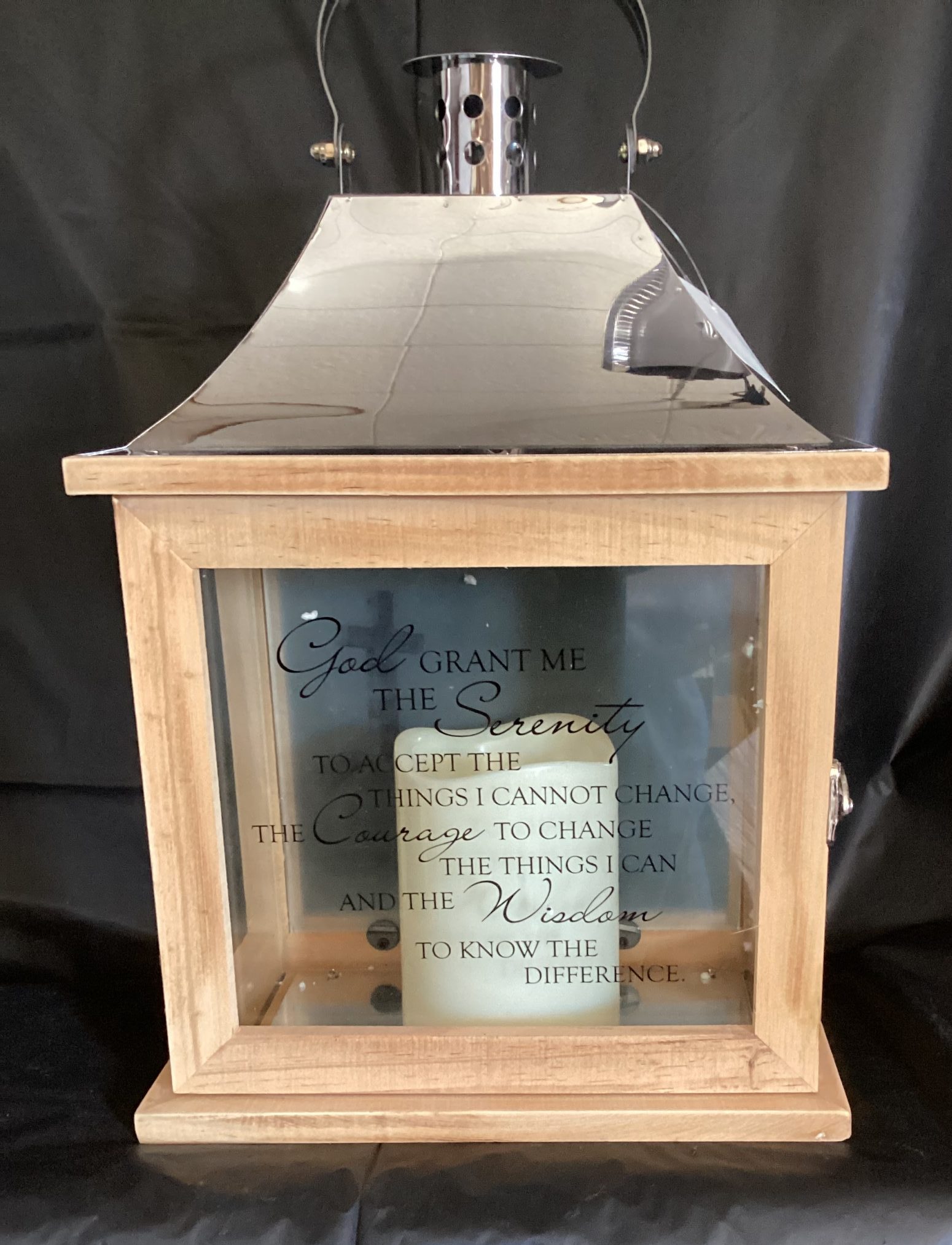Flameless LED Candle Lantern Made from Quality Wood and Stainless-Steel Finish on Top.Built in Automatic Timer, 6 Hours On/18 Hours Off. 3 AAA Batteries Not Included. Suitable for Hanging or use Freestanding. Indoor Use Only. Recommended as an Accent in Floral Arrangements.12 1/2" H x 8 3/4" W x 5 1/4" DGod Grant me the Serenity to Accept the Things I Cannot Change, the Courage to Change the Things I Can and the Wisdom to Know the Difference.