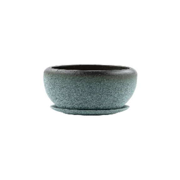 Small Blue Speckled Pot with Saucer. Ceramic.